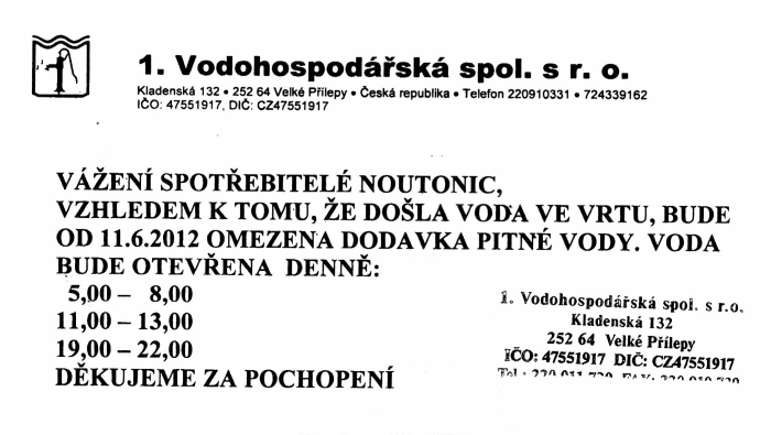 Aktualizace: Vyjadreni Vodohospodarske: "Vazeni spotrebitele Noutonic, vzhledem k tomu, ze dosla voda ve vrtu bude od 11.6.2012 omezena dodavka pitne vody. Voda bude otevrena denne od: 5:00 - 8:00, 11:00 - 13:00 a 19:00 - 22:00. Dekujeme za pochopeni."